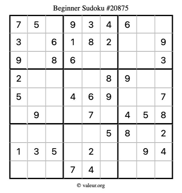 Here is our printable Beginner Sudoku Puzzle #20875. You are welcome to print a copy for yourself and solve it the old-fashioned way with a pencil and an eraser!