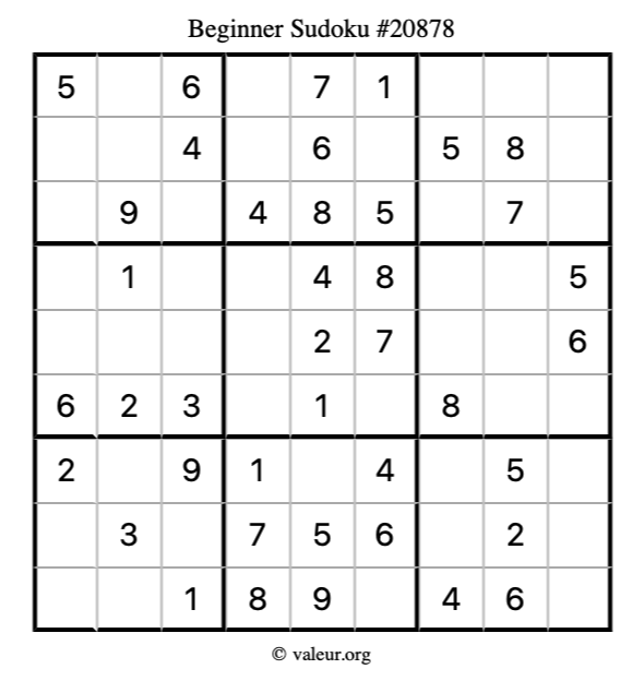 Here is our printable Beginner Sudoku Puzzle #20878. You are welcome to print a copy for yourself and solve it the old-fashioned way with a pencil and an eraser!