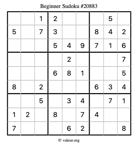 Here is our printable Beginner Sudoku Puzzle #20883. You are welcome to print a copy for yourself and solve it the old-fashioned way with a pencil and an eraser!