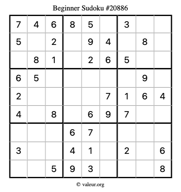 Here is our printable Beginner Sudoku Puzzle #20886. You are welcome to print a copy for yourself and solve it the old-fashioned way with a pencil and an eraser!
