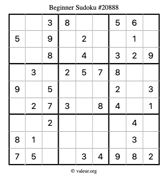 Here is our printable Beginner Sudoku Puzzle #20888. You are welcome to print a copy for yourself and solve it the old-fashioned way with a pencil and an eraser!