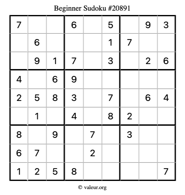 Here is our printable Beginner Sudoku Puzzle #20891. You are welcome to print a copy for yourself and solve it the old-fashioned way with a pencil and an eraser!