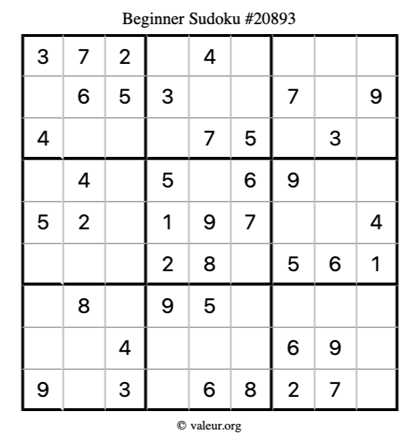 Here is our printable Beginner Sudoku Puzzle #20893. You are welcome to print a copy for yourself and solve it the old-fashioned way with a pencil and an eraser!