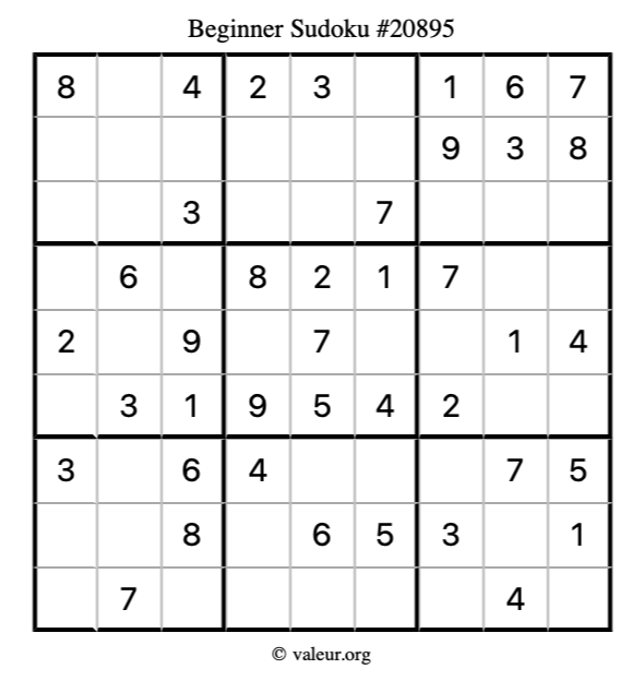 Here is our printable Beginner Sudoku Puzzle #20895. You are welcome to print a copy for yourself and solve it the old-fashioned way with a pencil and an eraser!