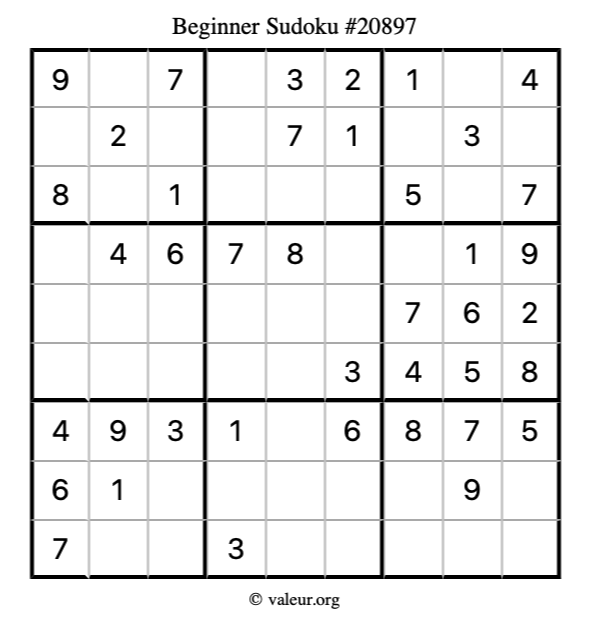 Here is our printable Beginner Sudoku Puzzle #20897. You are welcome to print a copy for yourself and solve it the old-fashioned way with a pencil and an eraser!