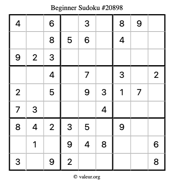 Here is our printable Beginner Sudoku Puzzle #20898. You are welcome to print a copy for yourself and solve it the old-fashioned way with a pencil and an eraser!