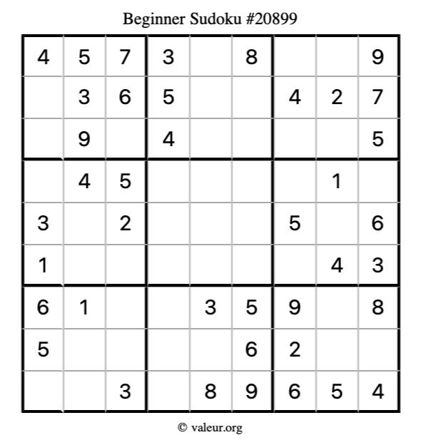 Here is our printable Beginner Sudoku Puzzle #20899. You are welcome to print a copy for yourself and solve it the old-fashioned way with a pencil and an eraser!