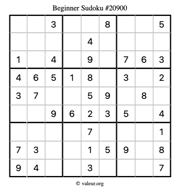 Here is our printable Beginner Sudoku Puzzle #20900. You are welcome to print a copy for yourself and solve it the old-fashioned way with a pencil and an eraser!