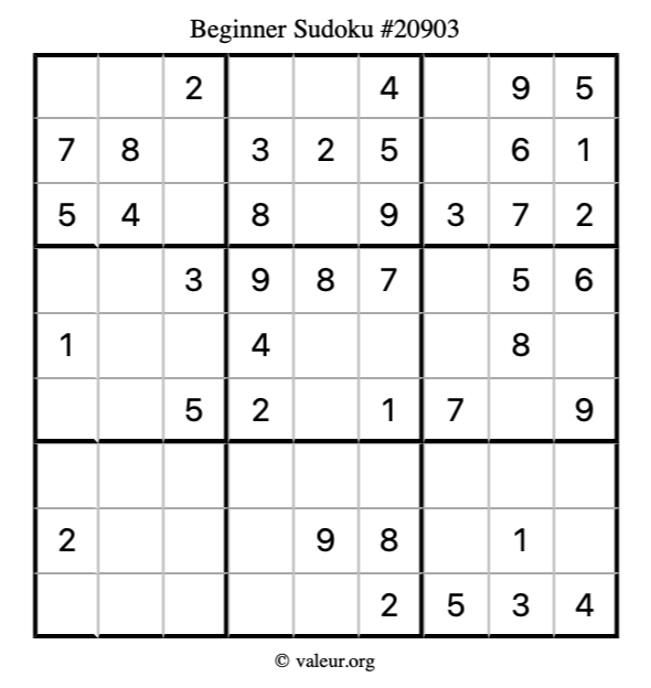 Here is our printable Beginner Sudoku Puzzle #20903. You are welcome to print a copy for yourself and solve it the old-fashioned way with a pencil and an eraser!