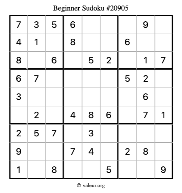 Here is our printable Beginner Sudoku Puzzle #20905. You are welcome to print a copy for yourself and solve it the old-fashioned way with a pencil and an eraser!