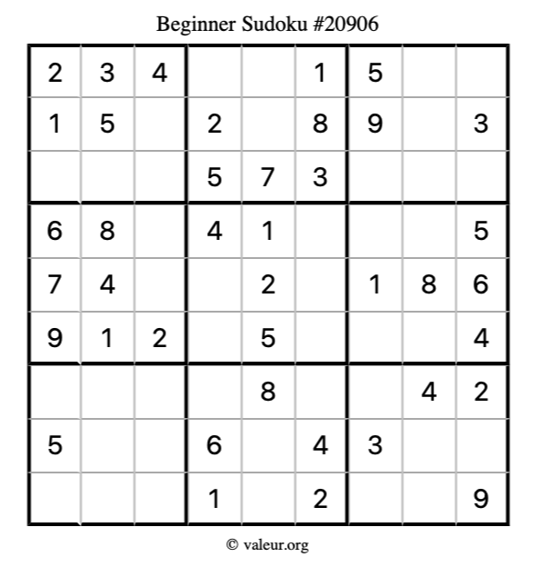 Here is our printable Beginner Sudoku Puzzle #20906. You are welcome to print a copy for yourself and solve it the old-fashioned way with a pencil and an eraser!