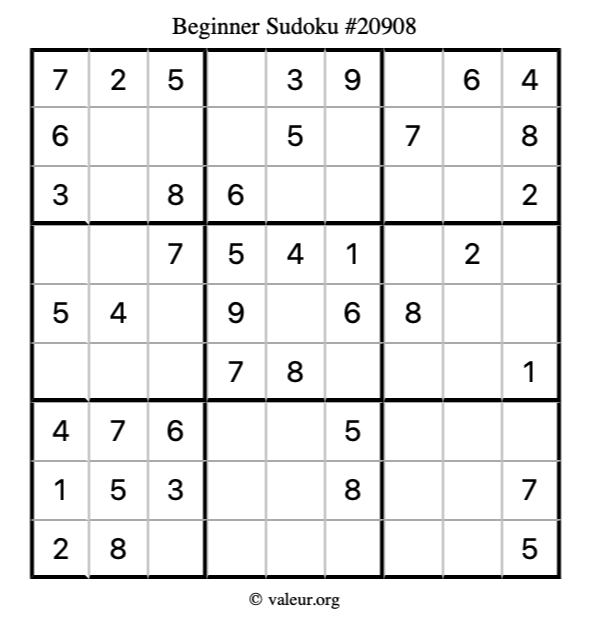 Here is our printable Beginner Sudoku Puzzle #20908. You are welcome to print a copy for yourself and solve it the old-fashioned way with a pencil and an eraser!