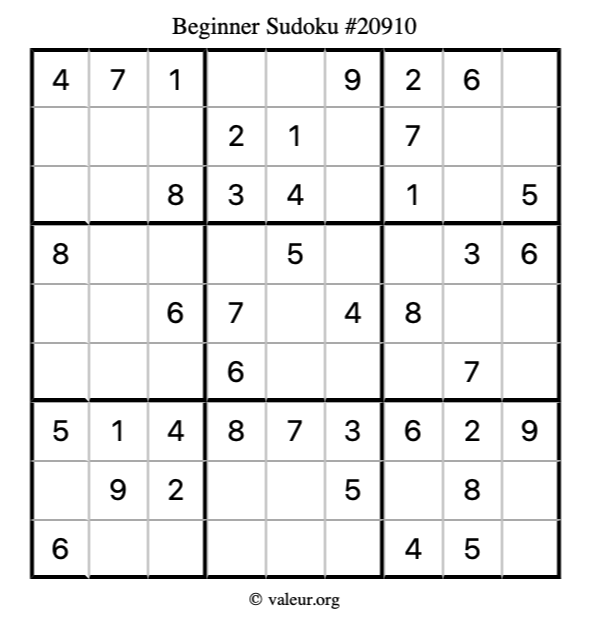 Here is our printable Beginner Sudoku Puzzle #20910. You are welcome to print a copy for yourself and solve it the old-fashioned way with a pencil and an eraser!