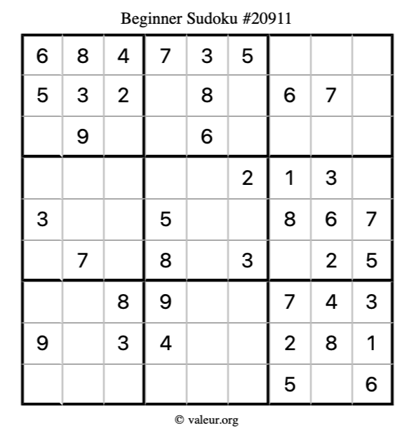 Here is our printable Beginner Sudoku Puzzle #20911. You are welcome to print a copy for yourself and solve it the old-fashioned way with a pencil and an eraser!