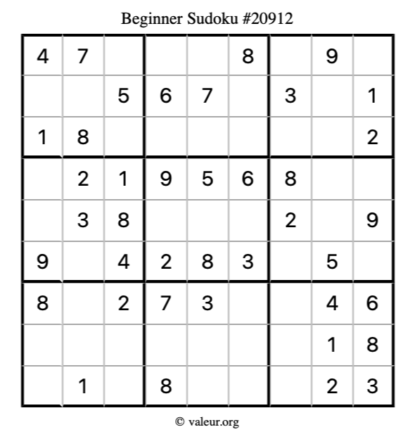 Here is our printable Beginner Sudoku Puzzle #20912. You are welcome to print a copy for yourself and solve it the old-fashioned way with a pencil and an eraser!