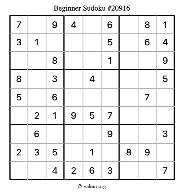 Here is our printable Beginner Sudoku Puzzle #20916. You are welcome to print a copy for yourself and solve it the old-fashioned way with a pencil and an eraser!