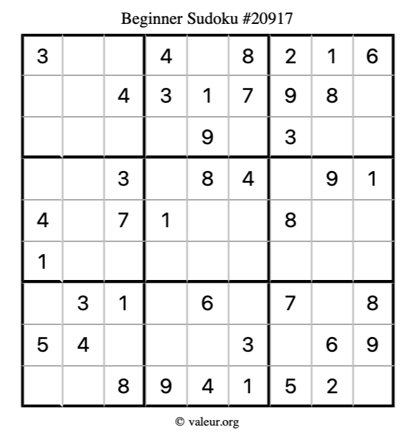 Here is our printable Beginner Sudoku Puzzle #20917. You are welcome to print a copy for yourself and solve it the old-fashioned way with a pencil and an eraser!