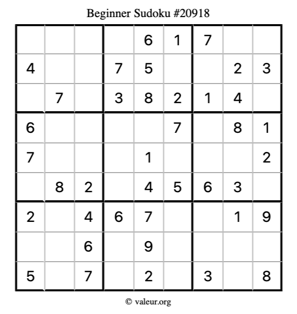 Here is our printable Beginner Sudoku Puzzle #20918. You are welcome to print a copy for yourself and solve it the old-fashioned way with a pencil and an eraser!