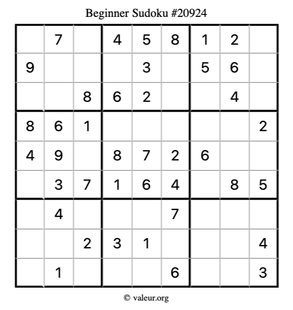 Here is our printable Beginner Sudoku Puzzle #20924. You are welcome to print a copy for yourself and solve it the old-fashioned way with a pencil and an eraser!