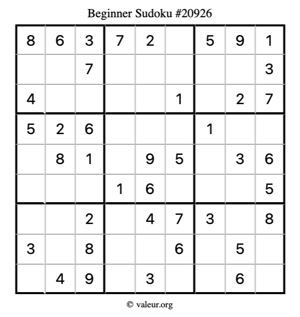 Here is our printable Beginner Sudoku Puzzle #20926. You are welcome to print a copy for yourself and solve it the old-fashioned way with a pencil and an eraser!
