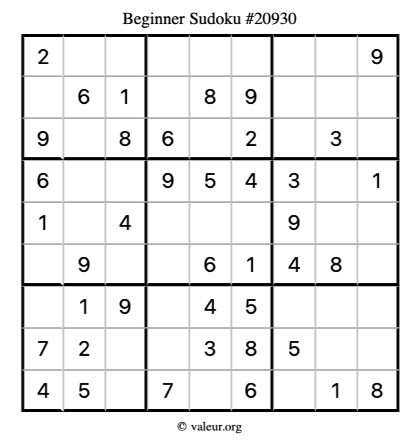 Here is our printable Beginner Sudoku Puzzle #20930. You are welcome to print a copy for yourself and solve it the old-fashioned way with a pencil and an eraser!