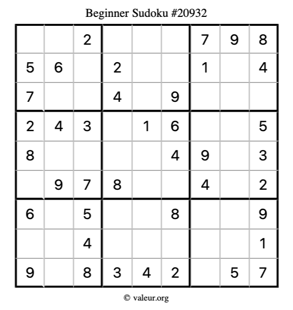 Here is our printable Beginner Sudoku Puzzle #20932. You are welcome to print a copy for yourself and solve it the old-fashioned way with a pencil and an eraser!