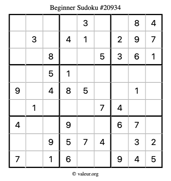 Here is our printable Beginner Sudoku Puzzle #20934. You are welcome to print a copy for yourself and solve it the old-fashioned way with a pencil and an eraser!