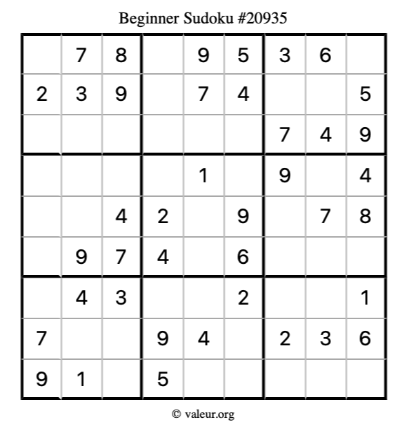 Here is our printable Beginner Sudoku Puzzle #20935. You are welcome to print a copy for yourself and solve it the old-fashioned way with a pencil and an eraser!