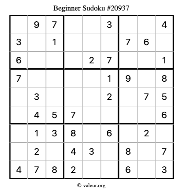 Here is our printable Beginner Sudoku Puzzle #20937. You are welcome to print a copy for yourself and solve it the old-fashioned way with a pencil and an eraser!