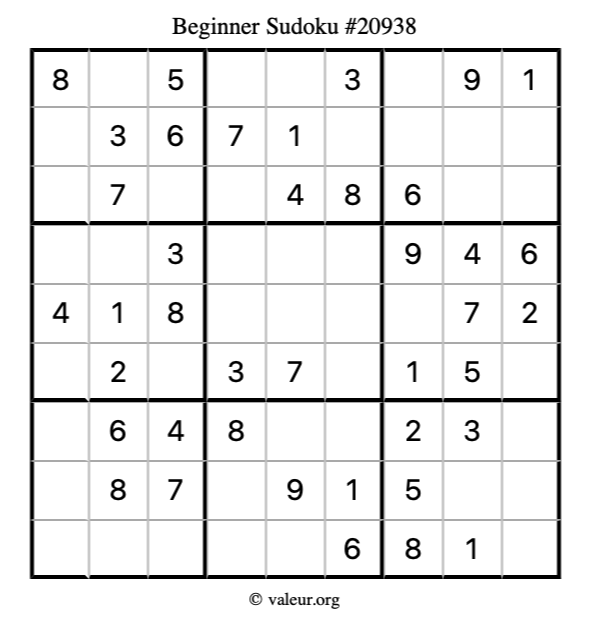 Here is our printable Beginner Sudoku Puzzle #20938. You are welcome to print a copy for yourself and solve it the old-fashioned way with a pencil and an eraser!