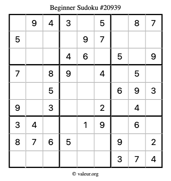 Here is our printable Beginner Sudoku Puzzle #20939. You are welcome to print a copy for yourself and solve it the old-fashioned way with a pencil and an eraser!