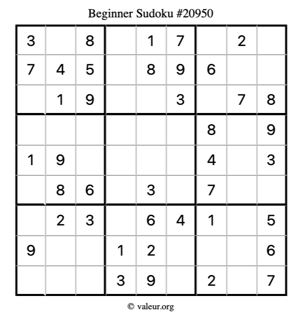 Here is our printable Beginner Sudoku Puzzle #20950. You are welcome to print a copy for yourself and solve it the old-fashioned way with a pencil and an eraser!