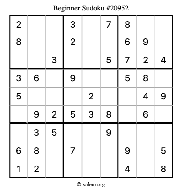 Here is our printable Beginner Sudoku Puzzle #20952. You are welcome to print a copy for yourself and solve it the old-fashioned way with a pencil and an eraser!