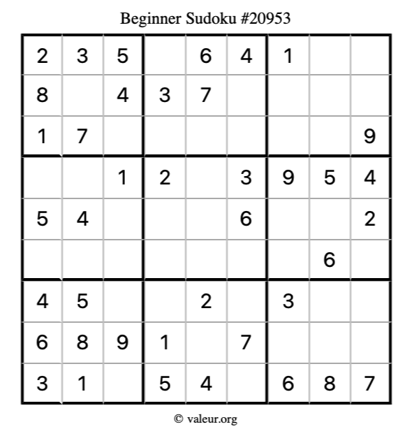 Here is our printable Beginner Sudoku Puzzle #20953. You are welcome to print a copy for yourself and solve it the old-fashioned way with a pencil and an eraser!