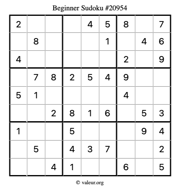 Here is our printable Beginner Sudoku Puzzle #20954. You are welcome to print a copy for yourself and solve it the old-fashioned way with a pencil and an eraser!