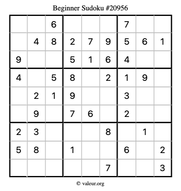 Here is our printable Beginner Sudoku Puzzle #20956. You are welcome to print a copy for yourself and solve it the old-fashioned way with a pencil and an eraser!