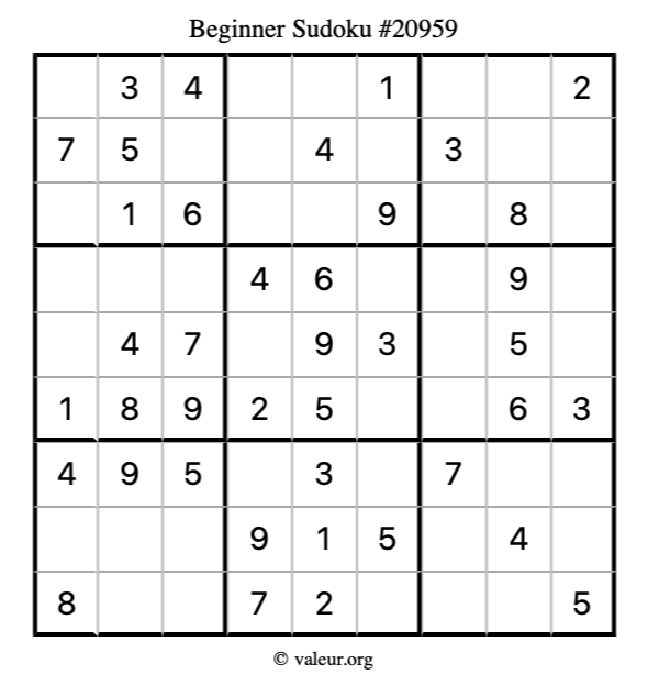 Here is our printable Beginner Sudoku Puzzle #20959. You are welcome to print a copy for yourself and solve it the old-fashioned way with a pencil and an eraser!