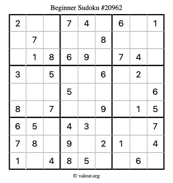 Here is our printable Beginner Sudoku Puzzle #20962. You are welcome to print a copy for yourself and solve it the old-fashioned way with a pencil and an eraser!
