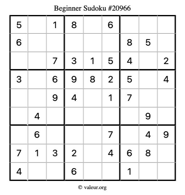 Here is our printable Beginner Sudoku Puzzle #20966. You are welcome to print a copy for yourself and solve it the old-fashioned way with a pencil and an eraser!