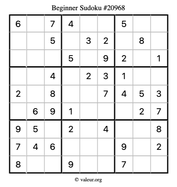 Here is our printable Beginner Sudoku Puzzle #20968. You are welcome to print a copy for yourself and solve it the old-fashioned way with a pencil and an eraser!