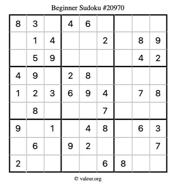 Here is our printable Beginner Sudoku Puzzle #20970. You are welcome to print a copy for yourself and solve it the old-fashioned way with a pencil and an eraser!