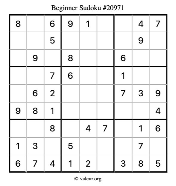 Here is our printable Beginner Sudoku Puzzle #20971. You are welcome to print a copy for yourself and solve it the old-fashioned way with a pencil and an eraser!