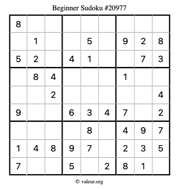 Here is our printable Beginner Sudoku Puzzle #20977. You are welcome to print a copy for yourself and solve it the old-fashioned way with a pencil and an eraser!