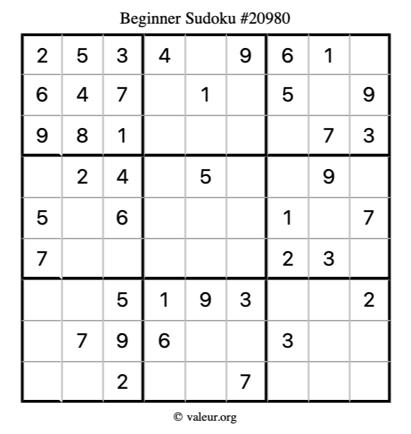 Here is our printable Beginner Sudoku Puzzle #20980. You are welcome to print a copy for yourself and solve it the old-fashioned way with a pencil and an eraser!