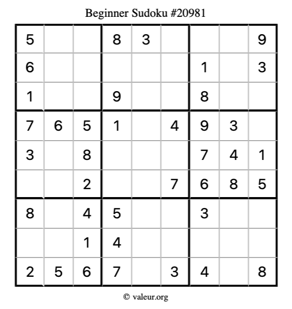 Here is our printable Beginner Sudoku Puzzle #20981. You are welcome to print a copy for yourself and solve it the old-fashioned way with a pencil and an eraser!