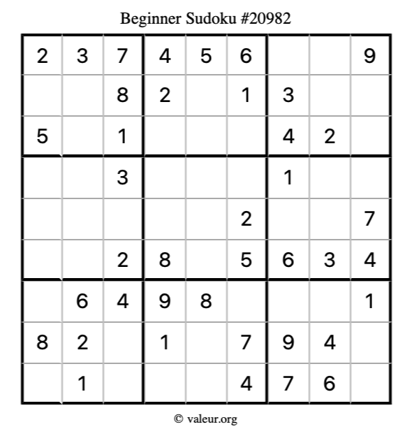Here is our printable Beginner Sudoku Puzzle #20982. You are welcome to print a copy for yourself and solve it the old-fashioned way with a pencil and an eraser!