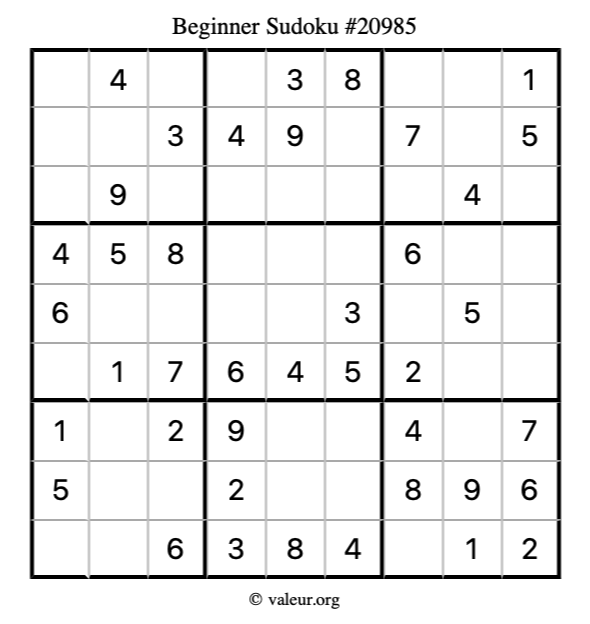 Here is our printable Beginner Sudoku Puzzle #20985. You are welcome to print a copy for yourself and solve it the old-fashioned way with a pencil and an eraser!