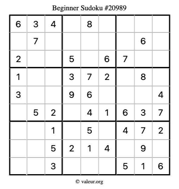 Here is our printable Beginner Sudoku Puzzle #20989. You are welcome to print a copy for yourself and solve it the old-fashioned way with a pencil and an eraser!