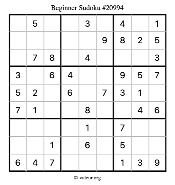 Here is our printable Beginner Sudoku Puzzle #20994. You are welcome to print a copy for yourself and solve it the old-fashioned way with a pencil and an eraser!