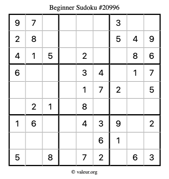 Here is our printable Beginner Sudoku Puzzle #20996. You are welcome to print a copy for yourself and solve it the old-fashioned way with a pencil and an eraser!